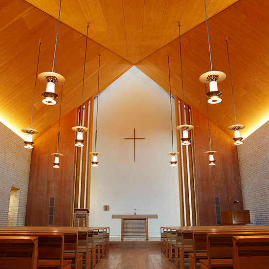 学院創設120周年を記念して建立されました。チャペルは、一般の方も利用できる安らぎの空間です。せせらぎが流れる回廊が静かな聖堂へと導きます。